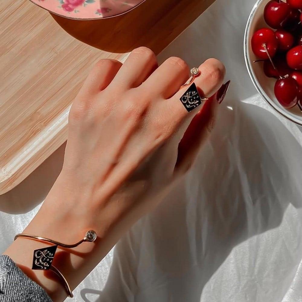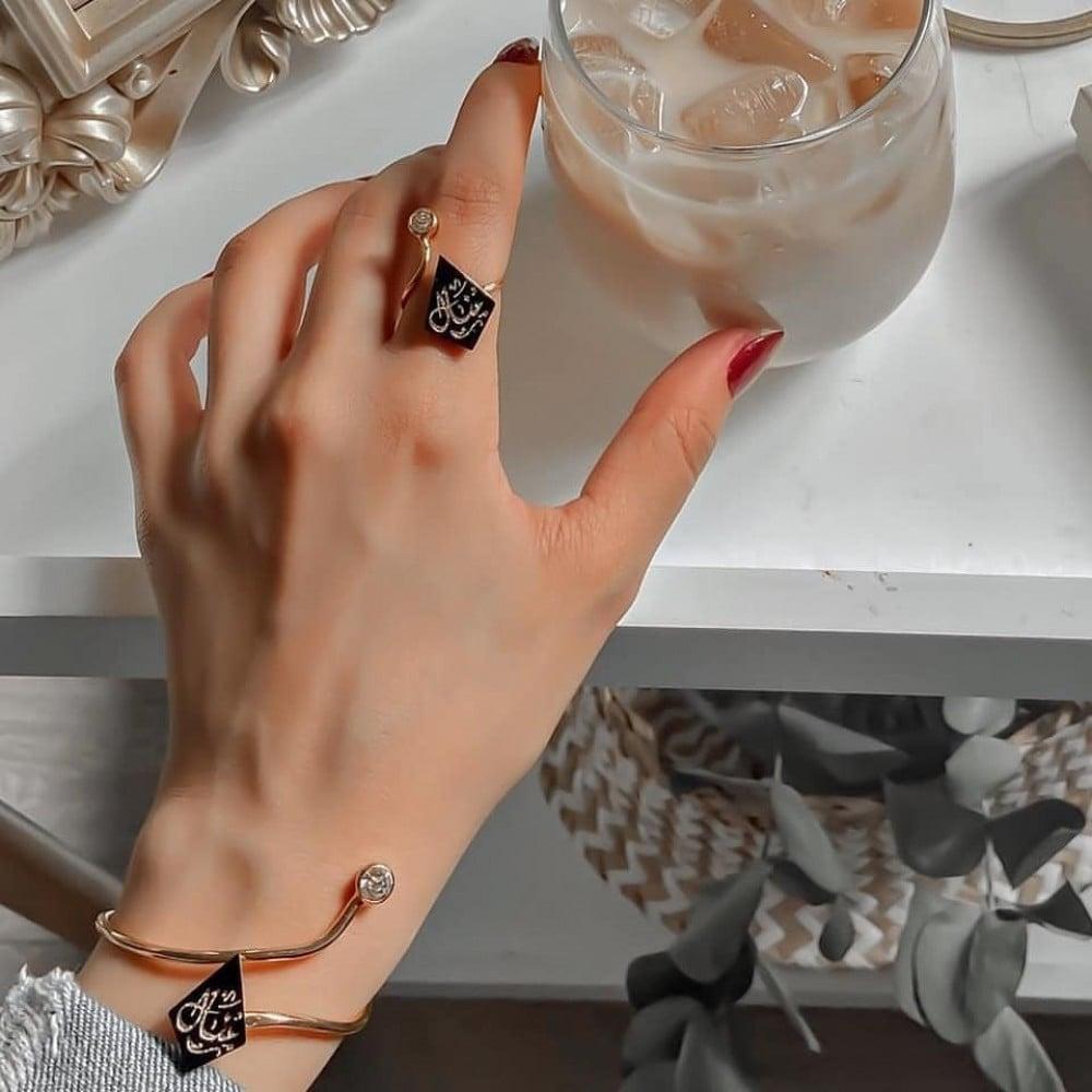 طقم نسائي من تصاميم لاراء، مصنوعة حسب الطلب مطلي ذهب مع حجر كريم ،ويتميز الطقم بالشكل المثلث المميز، مع خدمة حفر الاسم حسب الطلب