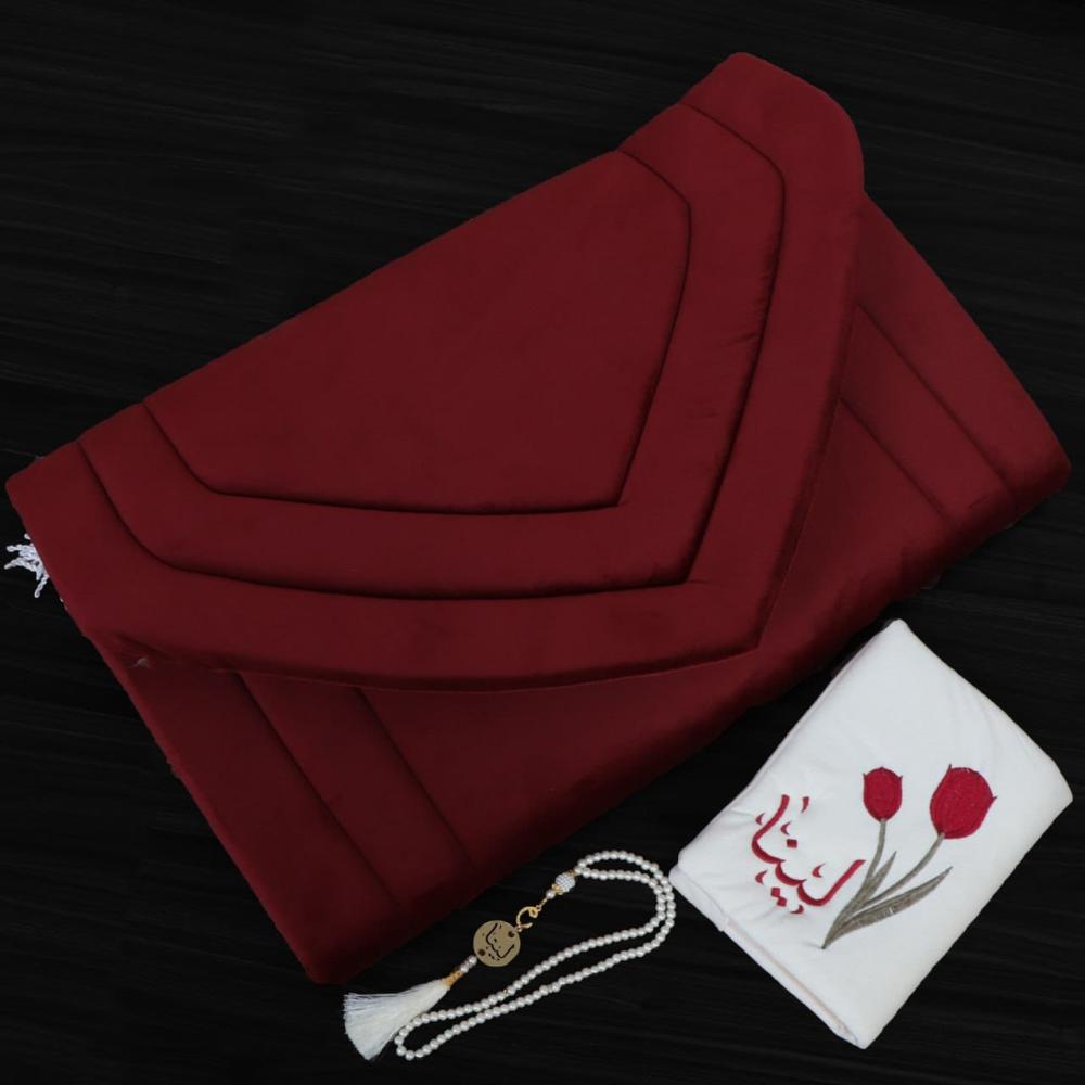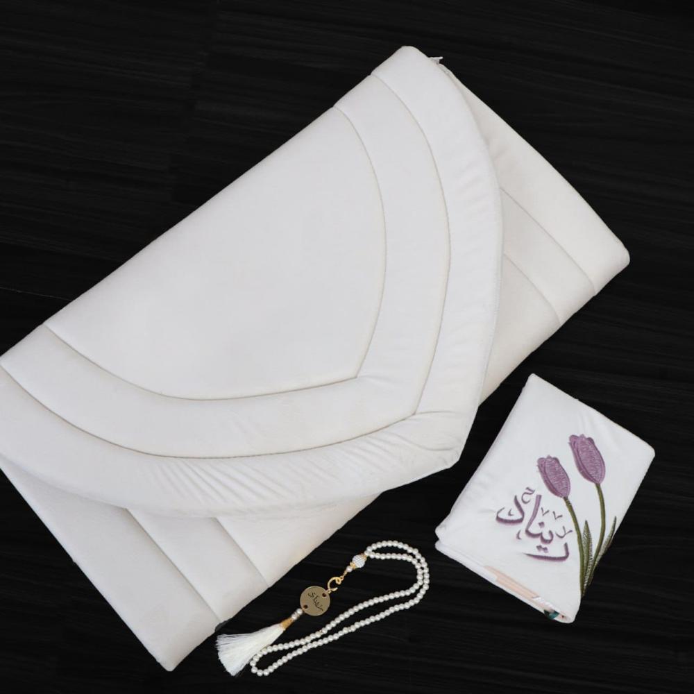 سجادة صلاة فاخرة: بتطريز جميل يحمل الاسم، مصنوعة من خامات ناعمة توفر راحة أثناء الصلاة.