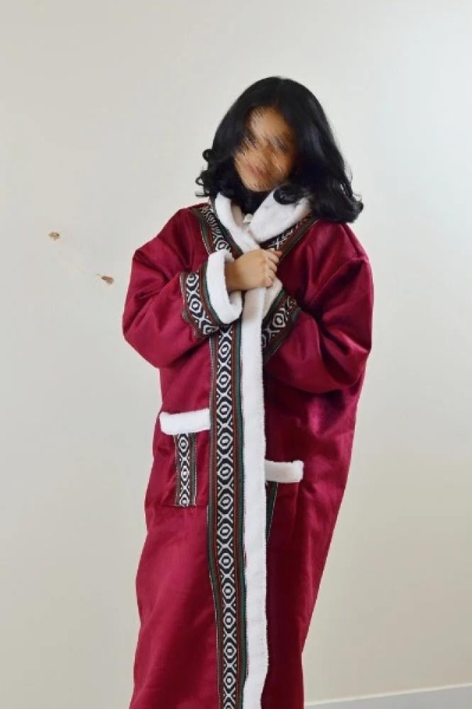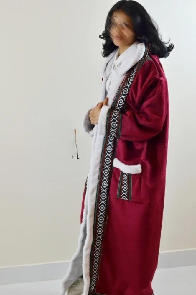 حافظ على أناقتك وفخامتك في فصل الشتاء مع أرقى فروة شتويه من الداخل فرو باللون العنابي بنقشة السدو البدوية المتألقة مع قبعة الرأس المنقوشة لدفء مضاعف وبتصميم مريح وعملي وفاخر