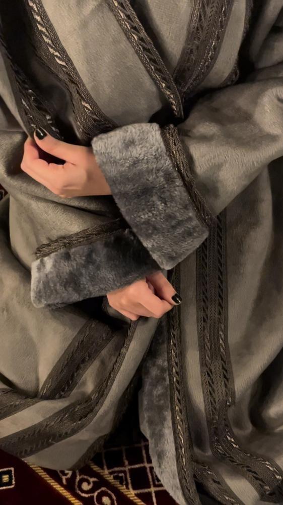 الأكمام والياقة مزينة ببطانة فرو ناعمة بلون رمادي داكن يمنحها مظهراً فخماً وإحساساً بالدفء.