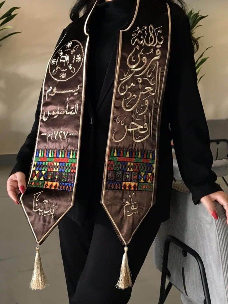 متوفر الآن بجودة عالية ليضفي على إطلالتك لمسة فريدة. احصل على هذا الوشاح الفريد ليصبح جزءًا من خزانتك واحتفِ بهويتك الثقافية."